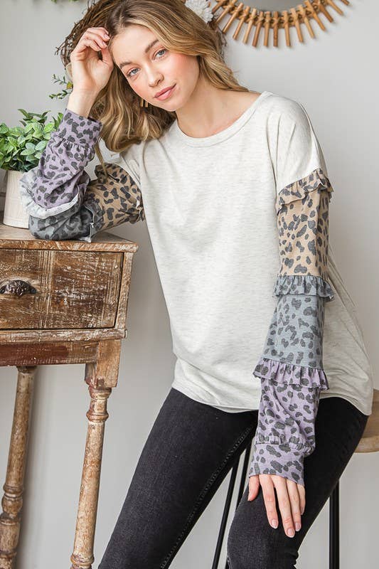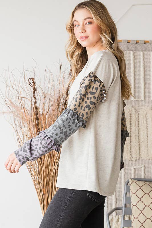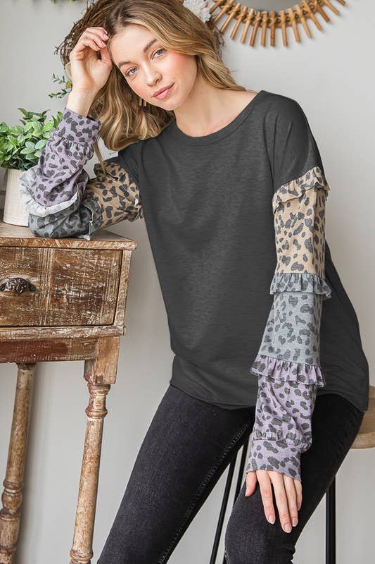 LONG PUFF SLEEVE ROUND NECK SOLID COLOR BLOCK AND ANIMAL PRINT CONTRAST TOP WITH RUFFLED DETAIL
