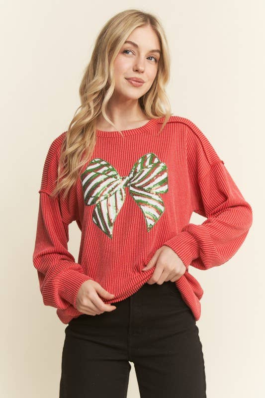 LONG SLEEVE ROUND NECK SOLID URBAN RIBBED CHRISTMAS RIBBON SEQUINS PATCH TOP
