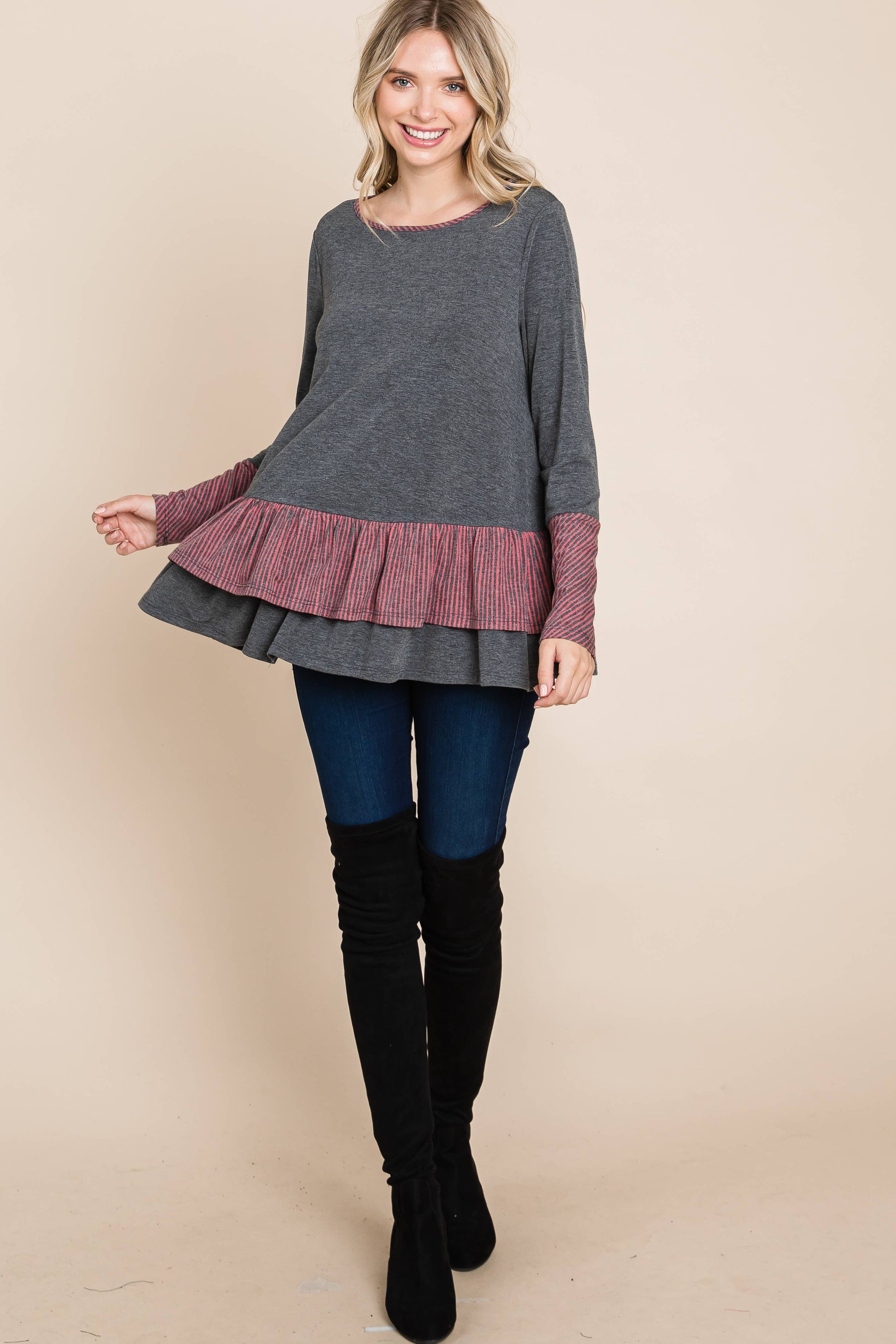 Plus Size Cute Solid Two Tier Ruffle Striped Hem Swing Tunic Top with Long Sleeves