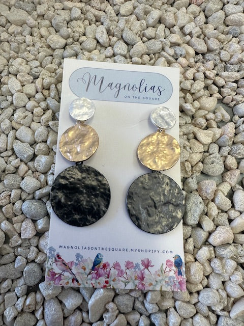 The Hammered Trio features an artistic combination of silver, gold, and black metals shaped into circles or triangles. Each piece’s textured surface adds depth and sophistication, making it a versatile choice for those who appreciate expert craftsmanship and subtle elegance. This trio seamlessly blends contemporary design with timeless metallic tones, elevating any collection or outfit with its unique geometric appeal.