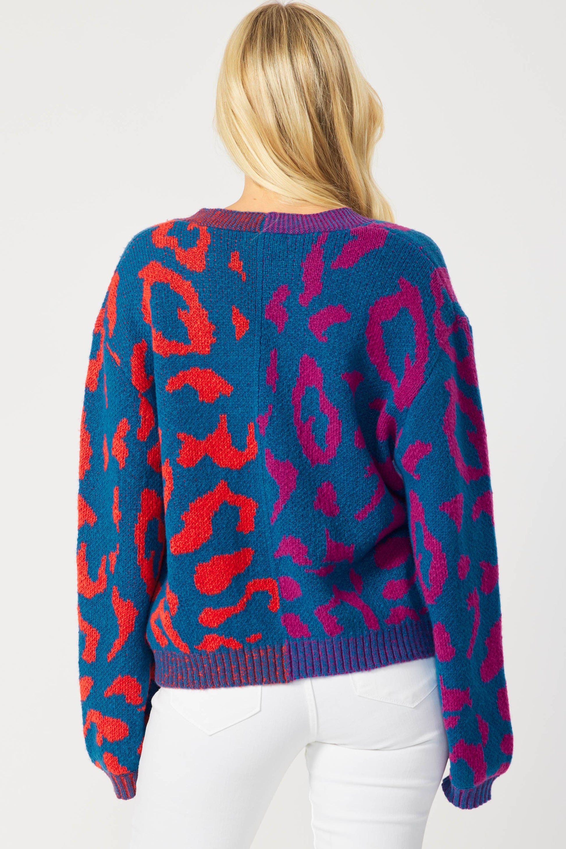 LEOPARD COLOR BLOCK BUTTON DOWN SWEATER CARDIGAN