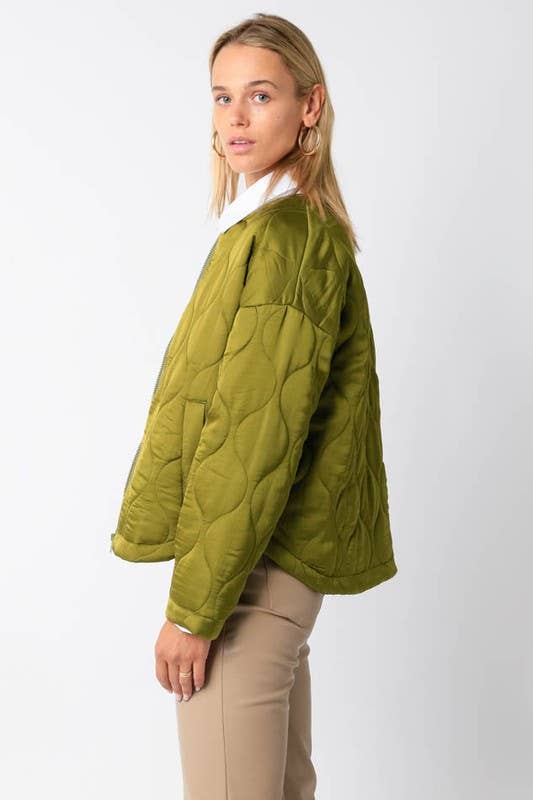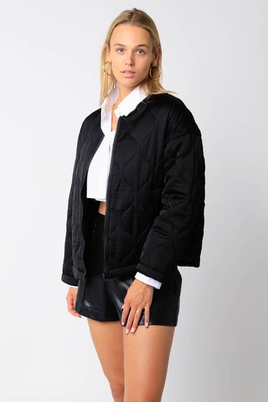 Our Quilted Jacket features a front zipper closure and a round neck.