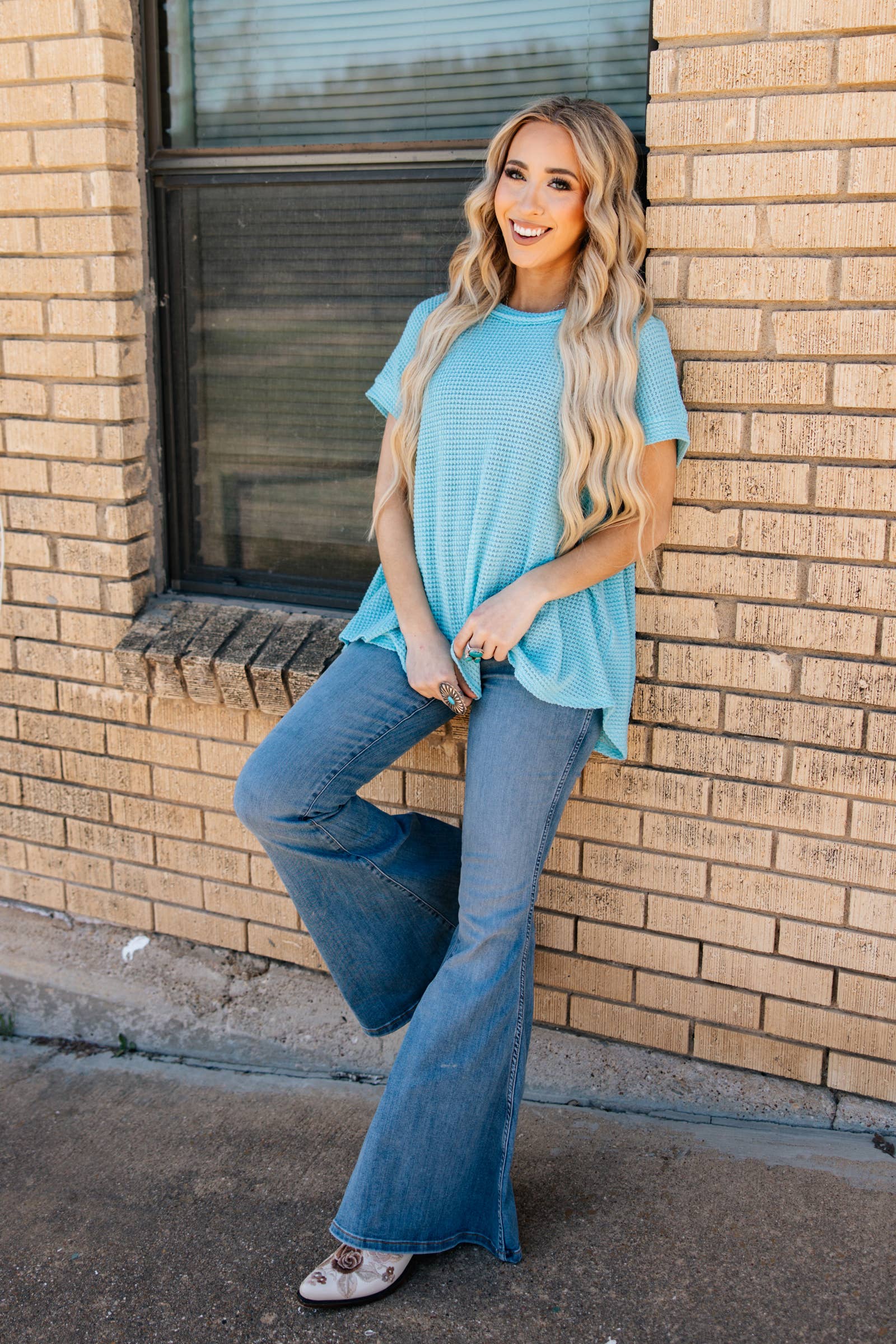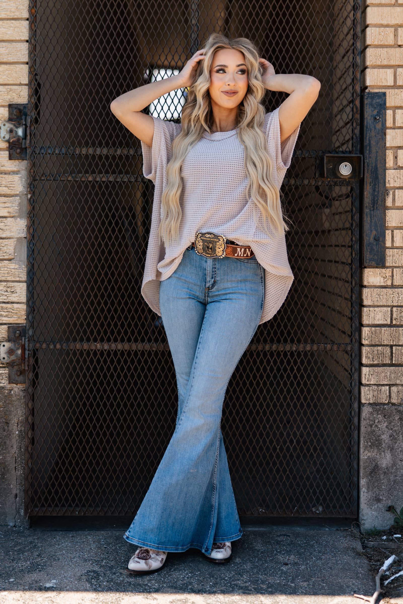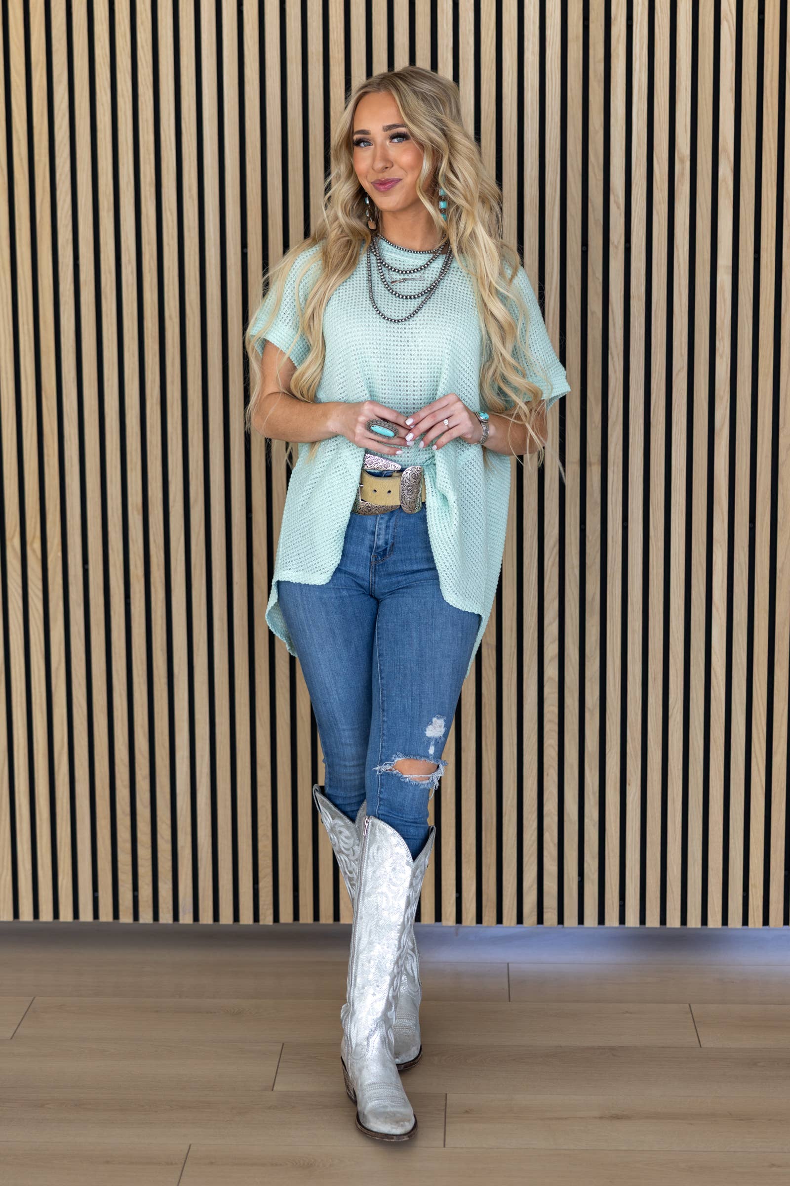 A crochet top with a round neckline and flowing poncho sleeves is designed with raw edges details along the top and front for a modern, laid back look.